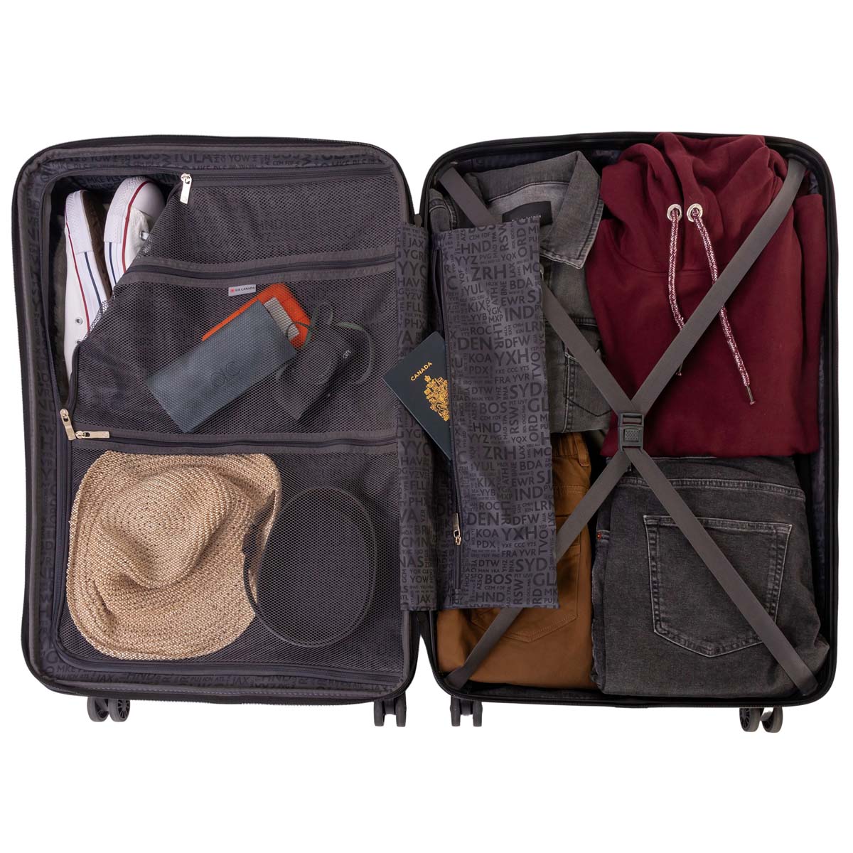 À l’intérieur, l’organisation intelligente rencontre l’élégance du design. Chaque pièce est entièrement doublée et équipée d’un séparateur à fermeture éclair, de sangles de compression élastiques et d’une pochette en filet zippée, pour garder vos effets bien rangés, en sécurité et sans faux plis.