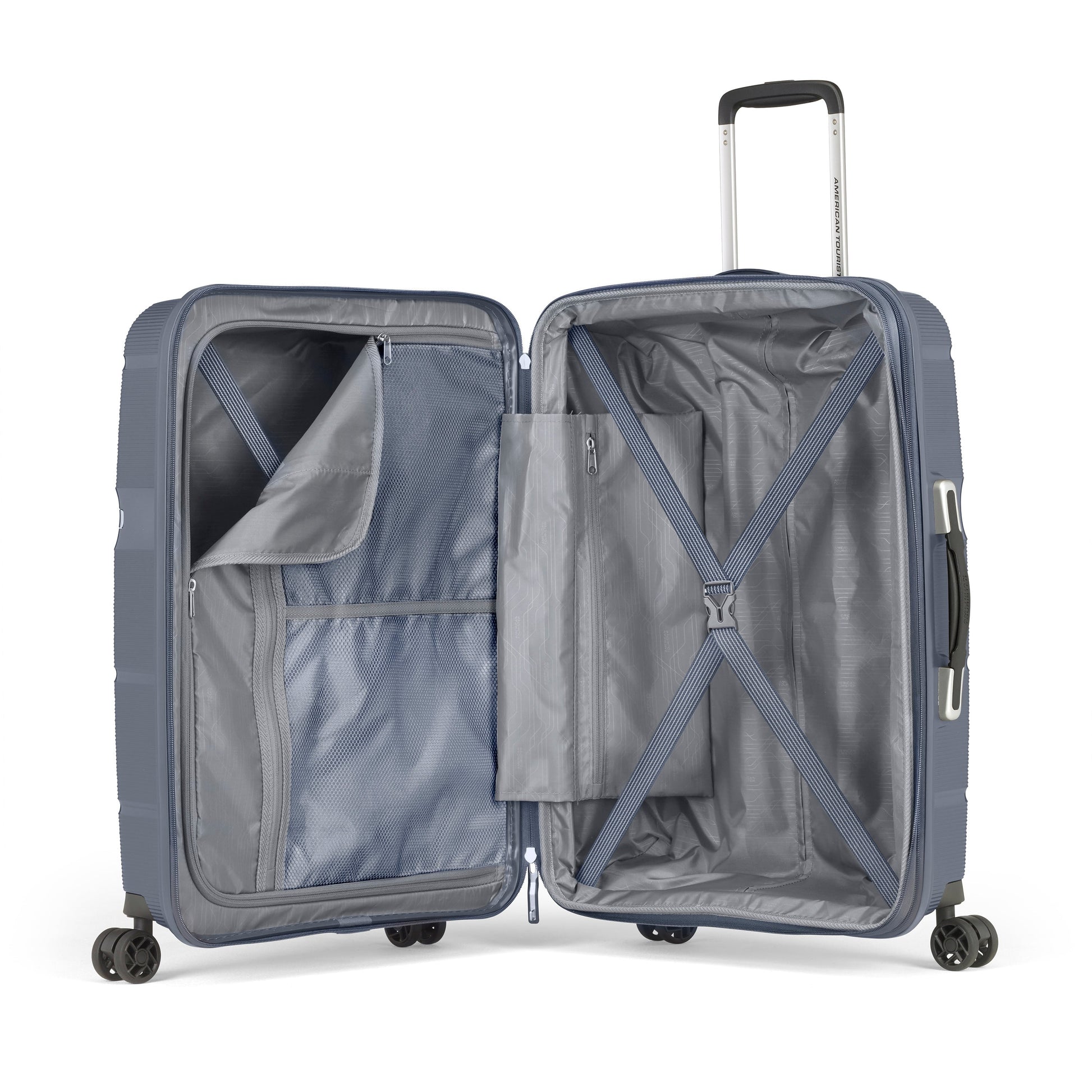 • Tirettes de fermeture éclair co-moulées signées American Tourister