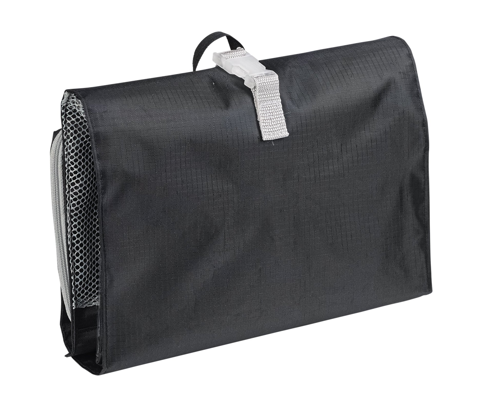 This hanging toiletry kit keeps essentials organized with multiple pockets and compartments. A built-in strap fits over most hooks and towel bars, while an adjustable fastener keeps everything securely closed for travel.