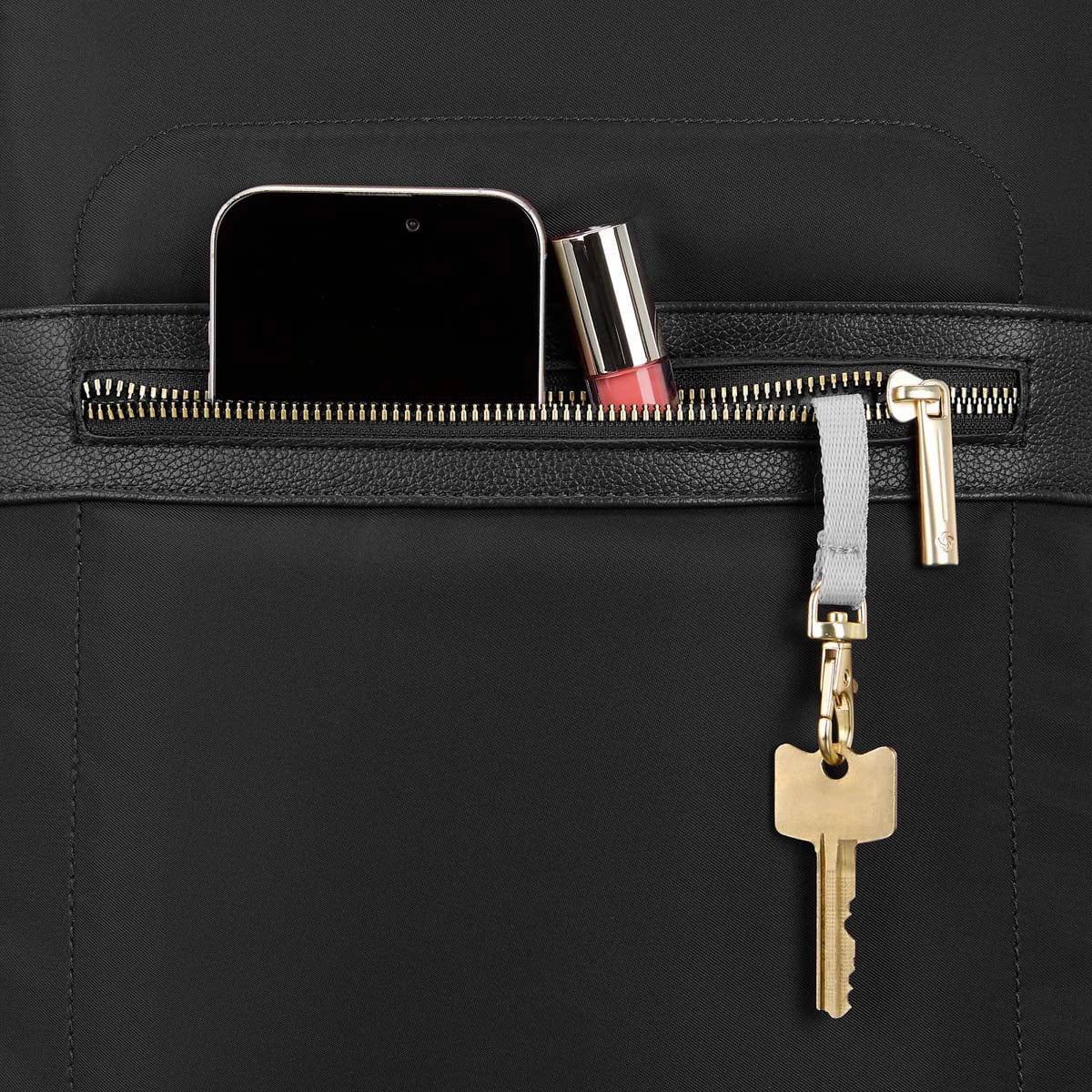 - Gold-coloured zippers and detailing lend to a sophisticated style
