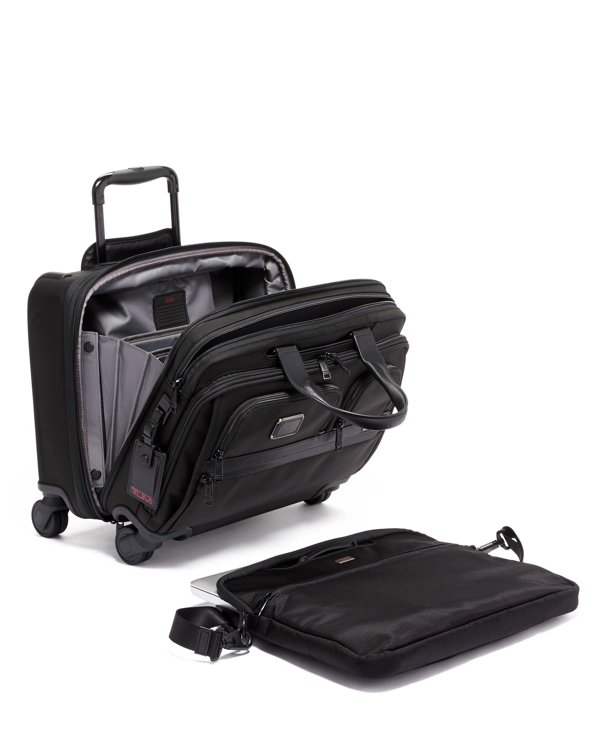 - Le séparateur central comporte un portfolio pour ordinateur portable amovible (convient à un écran de 15 po pour PC ou 16 po pour MacBook) et est livré avec une sangle détachable